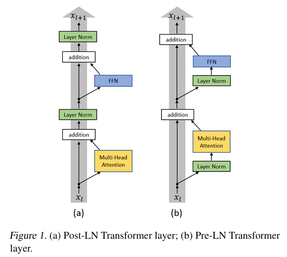 Post-Norm 相比于 Pre-Norm,训练的准确度会更高,但是训练的稳定性会更差。使用 Post-Norm 的模型深度不能很高,不然就容易训练失败。据说是因为 Pre-Norm 的残差通路上没有 LayerNorm ,使得梯度可以更好地向后传播。